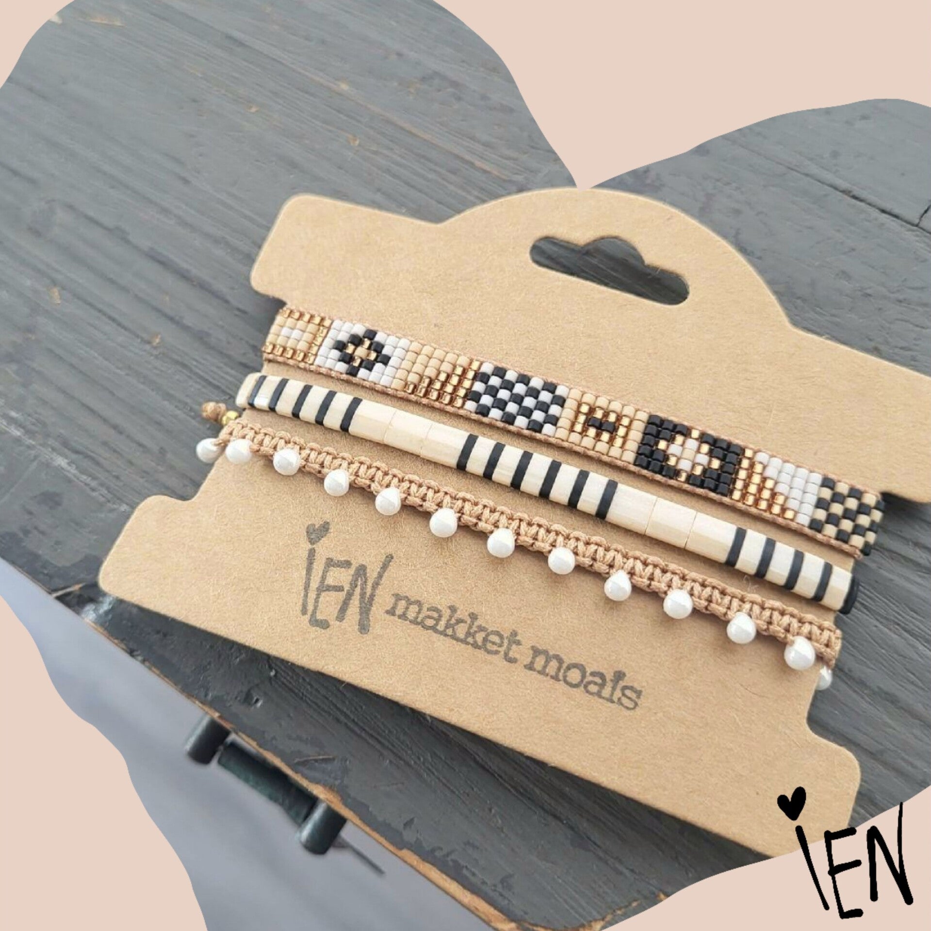 Ik maak mijn armbandjes allemaal met stevig nylonkoord als basis. Het voordeel daarvan is dat het niet rafelt, supersterk is en niet krimpt of uitzet. De kraaltjes die ik gebruik, komen uit Japan en zijn van glas gemaakt. Alle gouden bedeltjes en tussenzetsels zijn van Stainless Steel, waardoor ze mooi blijven en geen verkleuring op de huid geven. Door deze hoogwaardige materiaalkeuzes heb je heel lang plezier van je moais.